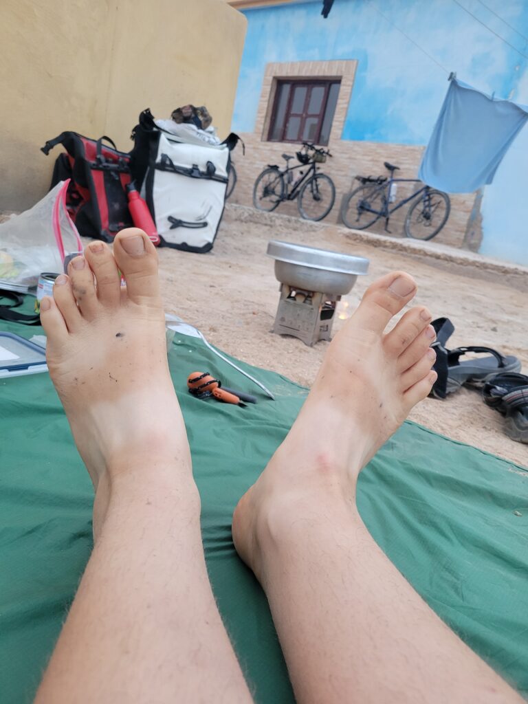 Bevor wir in 10 Tagen die mauretanische Grenze überqueren, werden wir davor sieben Kilometer durch das von der Frente Polisario kontrollierte Gebiet fahren. Laut Reiseberichten anderer Bikepacker ist auch dieses Vorhaben unproblematisch. Als Touristen, die sich in den unkritischen Gebieten aufhalten, kriegen wir von dem Konflikt wenig mit. Ab und an fragen wir unsere Gastgeber*innen nach ihren Meinungen zu dem Thema. Die Versionen sind recht unterschiedlich, aber wir sind froh, dass das Thema kein krasses Fettnäpfchen darstellt.