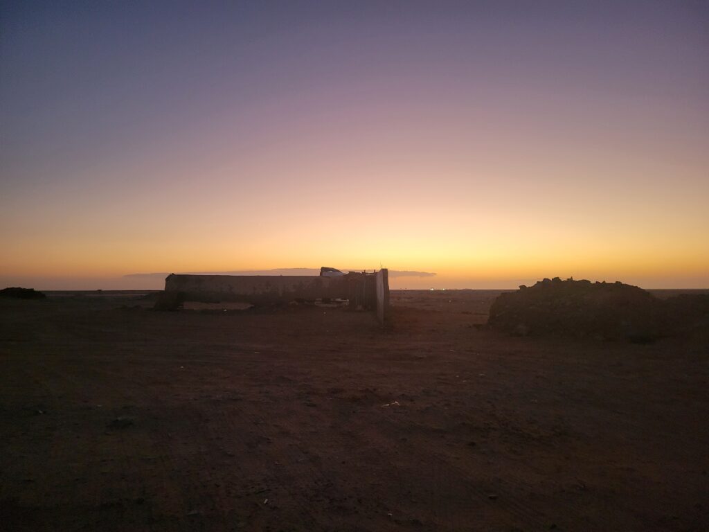Am Montag starten wir gestärkt in die erste Wochenetappe. 120 km und wir stellen einen neuen 40 km-Geschwindigkeitsrekord auf. Bisher rollt es sich in der Sahara wirklich gut. Wir haben zumeist Rückenwind, die Straße ist super: entweder vierspurig oder seit Laayoune zweispurig mit Seitenstreifen, auf dem wir uns sicher fühlen. Es gibt nicht viel Verkehr. Viele Lastwagen sind unterwegs, dafür kaum Autos oder Motorräder. Bei unserer ersten Nacht finden wir direkt einen Premiumschlafplatz über „iOverlander“: den dachlosen Anbau einer Moschee, windgeschützt und von der Straße aus nicht sichtbar.