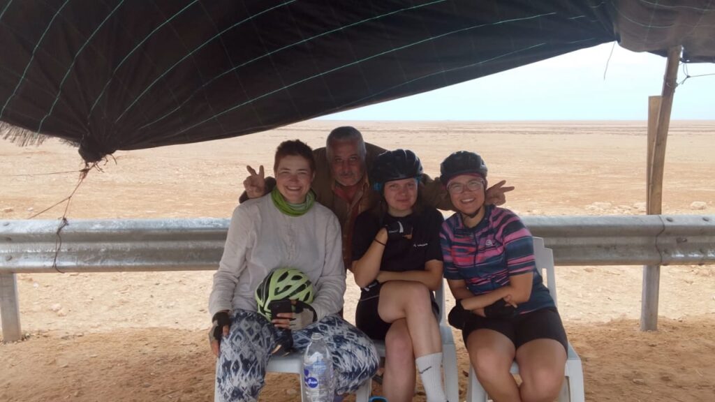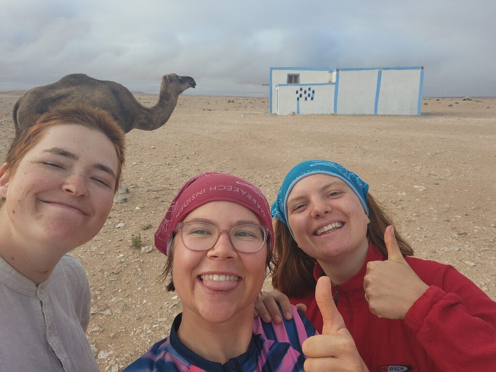 Zum Glück hatte uns die Polizei trotzdem in die Stadt hineingelassen. Bei größeren Städten fordert sie uns nun auf, unsere Reisepässe zu zeigen sowie anzugeben, wo wir übernachten werden, und ruft unsere Gastgeber an. Das ist ein Unterschied, den wir im Gebiet der Westsahara merken, in welches wir diese Woche gekommen sind. Der Westsaharakonflikt ist bis heute ungeklärt. Das Auswärtige Amt warnt aufgrund der unklaren politischen Lage vor der Region. Wir haben hier keine Probleme und merken erstmal nicht, dass wir in ein anderes Gebiet gekommen sind. Das Land steht unter marokkanischer Verwaltung – Amtssprachen, Währung und Militär bleiben gleich. Wir mussten keinen Grenzgang passieren. Es leben 10-30% Sahrawis hier und ansonsten Marokkaner*innen. Die Sahrawis sprechen einen anderen arabischen Dialekt und stammen von nomadischen Menschen aus der Westsahara ab.