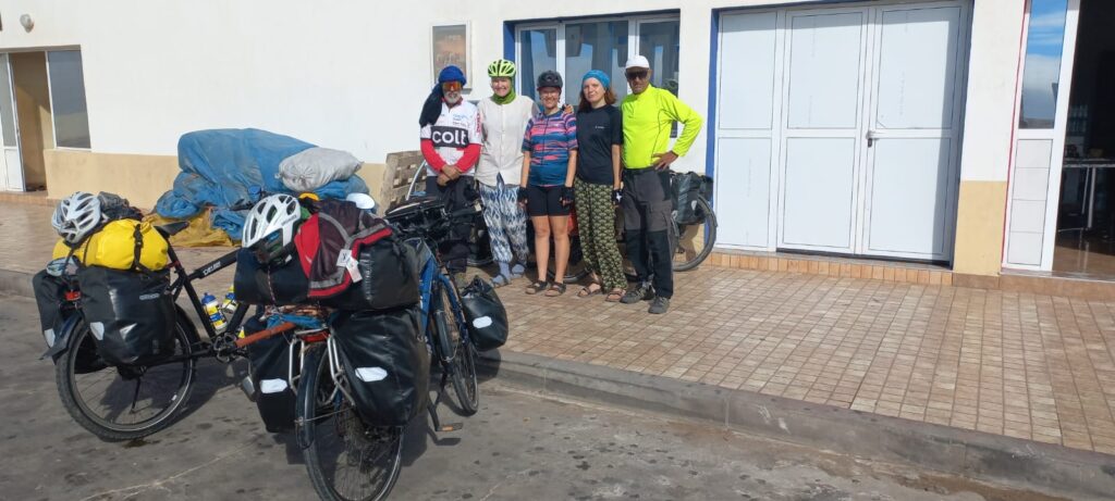 Und schon von Weitem erkennen wir, dass wir nicht die einzigen Radreisenden sind, die den Schlafplatz hitten möchten: Zwei Gestalten mit massiv beladenen Fahrrädern, Neonjacken und Turbanen stellen sich bei näherer Betrachtung als Mohammed und Jamal heraus. Ehemalige Soldaten aus Nordmarokko, nun Rentner, zwei langjährige Freunde, die einen Monat lang durch Marokko reisen. Sie heißen uns willkommen, bieten uns eines ihrer Zelte an und kochen Tajiine (ein marokkanisches Gericht bestehend aus geschmortem Gemüse) für uns. Abends verlegen sie ihren Schlafplatz zwischen die Straße und unsere Zeltecke, vielleicht ein väterlicher Beschützerinstinkt. Wir wünschen uns am nächsten Morgen gegenseitig eine gute Reise. Unsere neuen Freunde schwingen sich schon um sieben auf das Fahrrad, wir trödeln mal wieder bis um zehn. Auf unserer weiteren Wochenroute ist es unser Highlight, ihnen immer wieder zu begegnen. Mal an der Tanke, dann in Tah oder am Wegesrand, wenn sie für ihre Videos anhalten. Mohammed filmt Jamal, der alles Wissenswerte über die Umgebung erklärt. Wir sind stolz, auf ihrem Youtube-Kanal nun auch stabil vertreten zu sein (wer sich das 80-minütige Meisterwerk anschauen möchte: https://youtu.be/hc4IbKbPjTg?si=yaSjIGX7IkXO5Lk7, wir tauchen ab Minute 36 immer mal auf :).