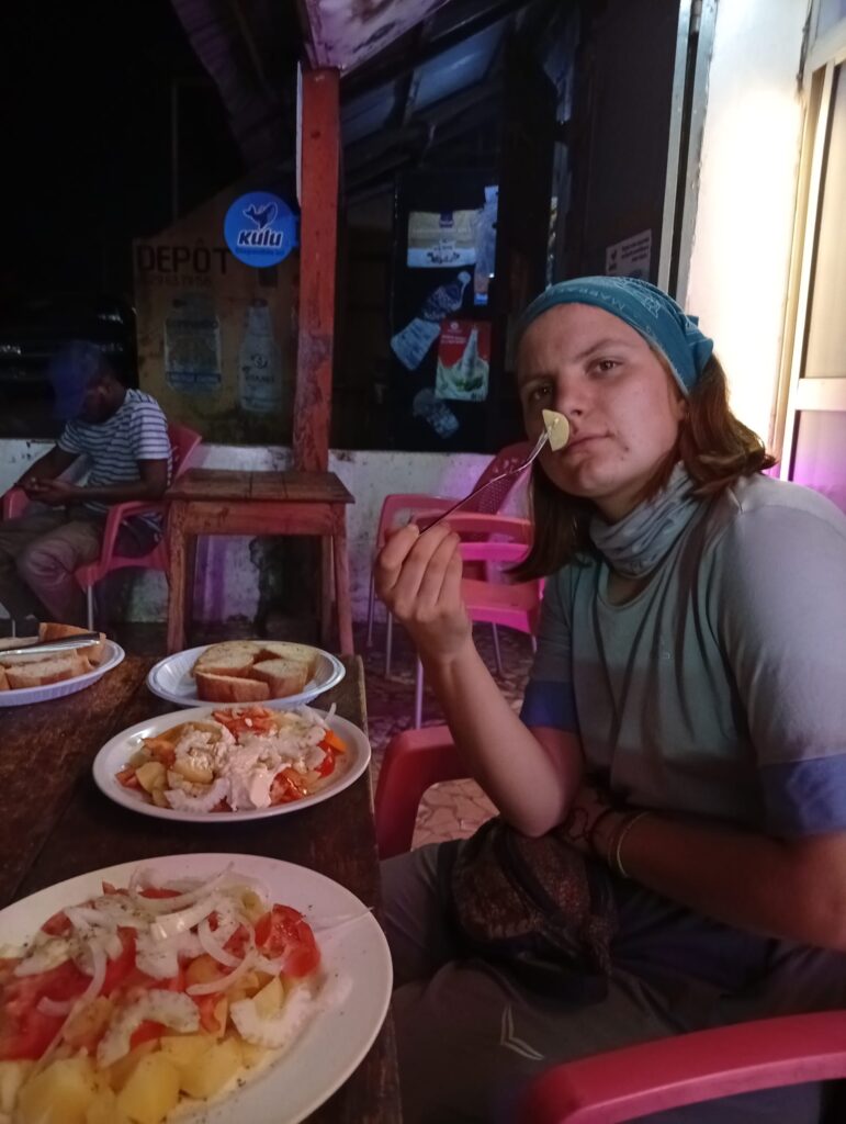 Gerade sitzen wir am Straßenrand und snacken Ananas, die direkt aus der Umgebung kommt. Avocado haben wir auch wieder gefunden (seit Mauretanien war das nicht mehr möglich), sodass wir auf mehr Abwechslung unserer Ernährung hoffen. Das Essensproblem nervt uns weiter, nervt uns seit Marokko. Das war unser kulinarisches Paradies, aber seitdem sind in Soßen immer Fleisch oder Fisch enthalten und der Geschmack macht Essen zu einer Verpflichtung, statt zu einem Vergnügen. Es gibt Reis mit Soßen aus Erdnuss, Maniok- oder Kartoffelblättern, Zwiebeln oder rotem Palmöl. Die andere Option besteht aus Weißbrot mit Bohnen. Man kann auch Spaghetti mit Bohnen oder Reis mit Bohnen kombinieren. Glücklich werden wir, wenn es gekochte Kartoffeln mit Tomaten und Zwiebeln oder Couscous aus Maniok gibt. Als Snacks finden wir frittierte Süßkartoffeln, eine Art Berliner ohne Füllung oder andere frittierte Dinge. Morgens essen wir Baguette mit Margarine oder Schokocreme, den Rest des Tages halten wir uns mit den anderen Dingen über Wasser. Ich persönlich wäre sehr froh, zum Beispiel nur ein Viertel meines Kalorienbedarfs zu haben. Man kann beim Fahrradfahren halt schlecht auf Essen verzichten. Und die Suche kann auch wegen der Kommunikationsprobleme nerven. Wir fragen nach Kartoffeln und es wird angenommen, dass wir diese anpflanzen wollen. Das mit dem vegetarisch ist auch schwer rüberzubringen.