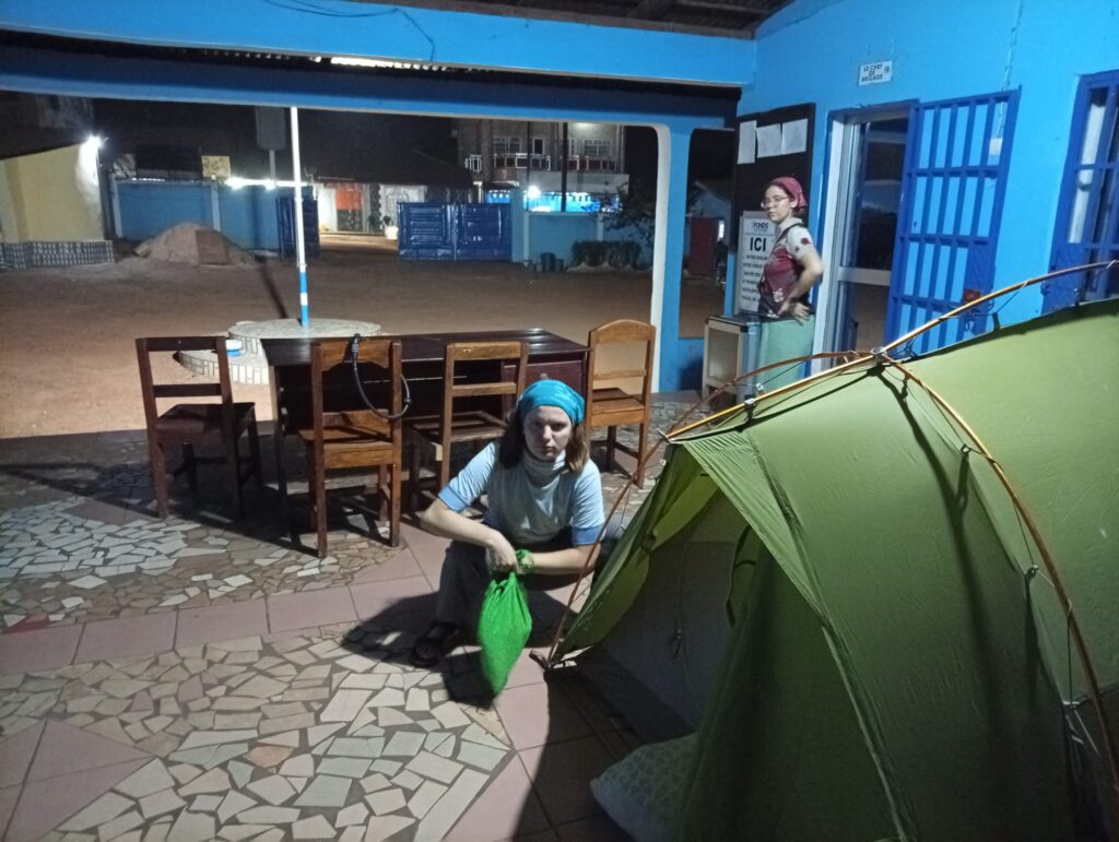 Wohl fiel uns auch diese Woche das Essen schwerer, weil wir wieder mit Krankheiten umgehen mussten. Ich, Selma kann das vierte Mal Malaria in meinem Lebenslauf markieren. Trotz sorgfältiger Einnahme der Prophylaxe, man sieht, sie bietet keinen hundertprozentigen Schutz. Wir hatten immerhin Glück im Unglück. Der Ort im Dorf, wo wir uns Wasser holten und Sarah ihren dritten Platten innerhalb von zwei Tagen flickte, war zufälligerweise ein Krankenhaus. Ich konnte am selben Tag, da wir das Fieber feststellten, dort umsonst einen Malariatest machen und Medikamente bekommen. Das medizinische Personal war sehr nett und wir durften in einem Raum zelten, sodass es mir am nächsten Tag bereits viel besser ging. Man merkte auch wieder, wie wenig dramatisch Malaria hier im Vergleich zu Deutschland aufgenommen wird. Anstatt mir den positiven Ausgang des Tests mitzuteilen, diskutierten die Ärzte erstmal mit mir, welche fiebersenkenden Mittel ich einnehmen sollte. Erst auf Nachfrage erfuhr ich, dass ich Malaria habe.
