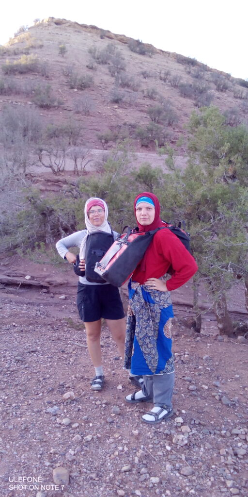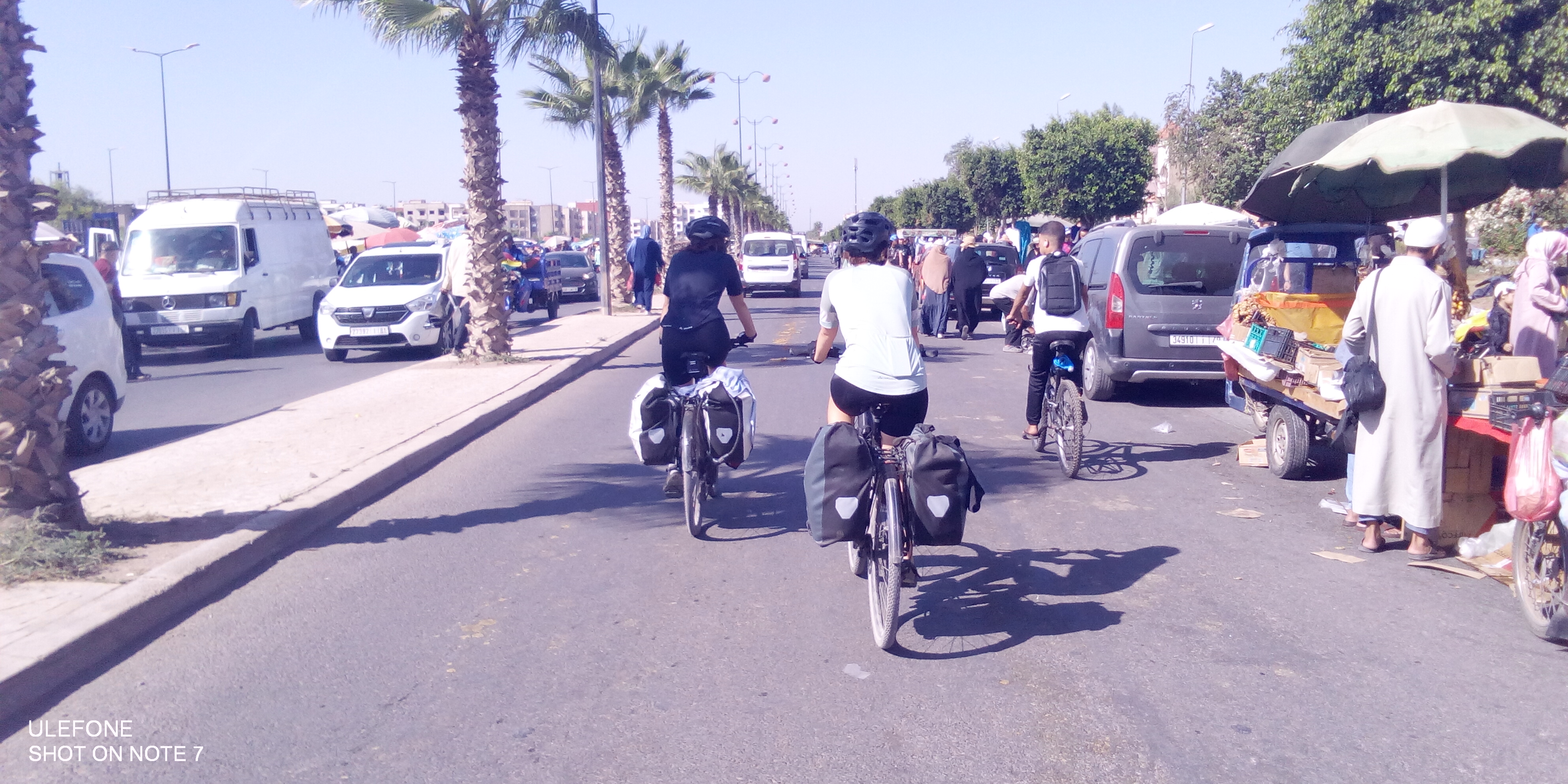 Wir treffen unterwegs einen anderen Fahrradreisenden, der von Süd- nach Nordafrika fährt und am Ende seiner Reise steht. „Unterschätzt nicht eure Präsenz, was es bedeutet, dass ihr da seid.“, sagt er. Er scheint aufzugehen in seiner Reise und Westafrika. „Wenn die Welt so wäre, wie ich die Menschen hier erlebe. Wenn sich alle so unterstützen würden. Dann wäre alles in Ordnung.“ Wir schauen ihn an, wie er da steht und so erfüllt wirkt und können nicht anders, als ihm zuzustimmen. Sarah hat ihren kleinen Fangirl-Moment, denn sie kennt den Bikepacker von Instagram. „Ihr gebt den Menschen Energie“, sagt unser Couchsurfing-Gastgeber in Marrakesch. „So wie sie euch Energie geben.“ Er gibt uns seine Gastfreundschaft, seine Zeit, zwei Übernachtungen in seiner Wohnung, lädt uns ein zum Essen in der Altstadt. Wir kochen zusammen, er erhitzt Auberginen im Feuer des Gasherdes nach einem alten Rezept seiner Oma. Serviert in einem Tonteller mit heißem Öl und Knoblauch. Der Nudelsalat, den wir fabrizieren, sieht daneben fahl und deutsch aus. Doch die Kombi schmeckt gut!